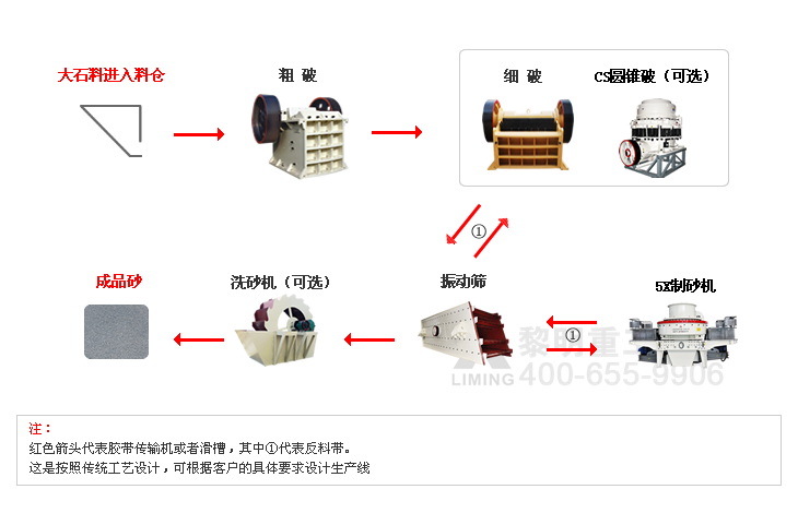 制砂的話需要另加制砂機和洗砂機,滿足制砂機進料粒度的石子進制砂機制砂,另一部分返料進細破。進制砂機的石子一部分制成砂,經洗砂機(可選)清洗后制成成品砂,另一部分進制砂機再次破碎。